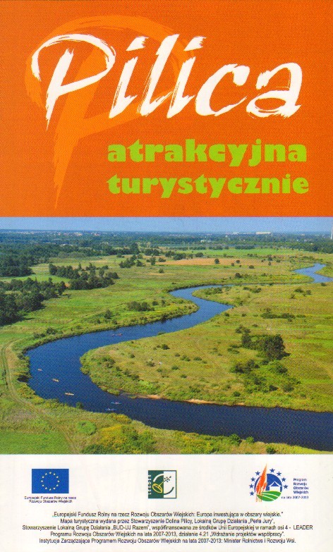 Mapa turystyczna pokazująca dolinę Pilicy oraz miejscowości położone wzdłuż jej brzegów.