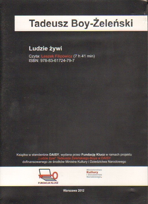 Ludzie żywi [Dokument dźwiękowy] / Tadeusz Boy-Żeleński. - Warszawa : Fundacja Klucz, 2012. - 1 płyta audio (CD) (format Daisy) (7 godz. 41 min) : digital, stereo. ; 12 cm.