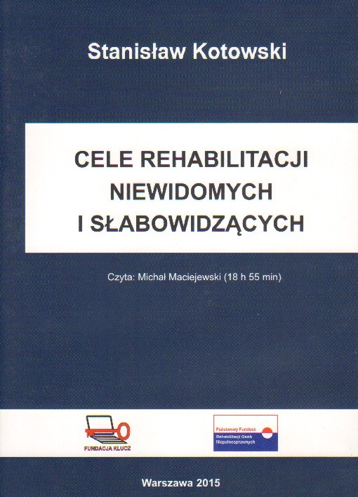 Cele rehabilitacji niewidomych i słabowidzących [Dokument dźwiękowy] / Stanisław Kotowski. - Warszawa : Fundacja Klucz, 2015. - 1 płyta (CD) (format Daisy) (18 godz. 55 min) : digital, stereo. ; 12 cm.