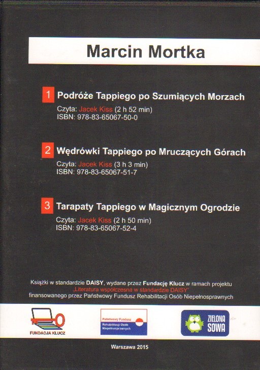 Podróże Tappiego po Szumiących Morzach ; Wędrówki Tappiego po Mruczących Górach ; Tarapaty Tappiego w Magicznym Ogrodzie / Marcin Mortka. - Warszawa : Fundacja Klucz, 2015. - 1 płyta audio (CD) (format Daisy) (2 godz. 52 min, 3 godz. 3 min, 2 godz. 50 min) : digital, stereo. ; 12 cm.
