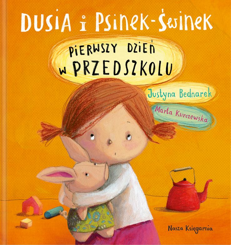 "Dusia i Psinek-Świnek" to seria książek o dziewczynce, która poznaje świat wokół siebie razem z mamą, tatą, najlepszym przyjacielem Tomkiem, a przede wszystkim z Psinkiem-Świnkiem, który ma także własne tajemnice! Magdalena Felicja, dla przyjaciół Dusia, wcale nie wie, czy chce iść do tego całego przedszkola. A jak wiadomo, na odwagę najlepiej robią pluszaki, więc mama szyje córeczce przytulankę. Świnkę w spodniach w kwiatki! Dusia z początku jest zdziwiona. Przecież mówiła mamie wyraźnie (no, może tylko trochę ziewaaaaając), że chce psiaka. Nie prosiaka! Lecz gdy tylko Psinek-Świnek pojawia się na świecie, już wiadomo, że on i Dusia będą nierozłączni. W przedszkolu Dusia poznaje Monikę, która gryzie, Joasię, która boi się ubrudzić, i Tomka, który zamiast zabawki przyniósł ze sobą prawdziwy czerwony czajniczek! Taki czajniczek świetnie się nada na domek dla Psinka-Świnka, który przeżyje w środku swoje własne zwariowane przygody... Po namyśle Dusia dochodzi do wniosku, że chyba pójdzie jeszcze raz do tego całego przedszkola…