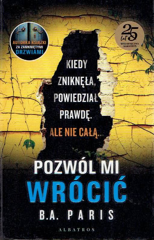 Autor: B.A. Paris Tytuł: Pozwól mi wrócić Tytuł oryginalny: Bring Me Back Wydawnictwo: Albatros Czas trwania: 7 godz. 28 min Fin podczas podróży do Francji zatrzymuje się na parkingu, by skorzystać z toalety. Gdy wraca do auta, jego dziewczyny w nim nie ma, mimo że parę chwil wcześniej zostawiał ją w środku. Layla znika bez śladu, a wielu nie daje wiary w zapewnienia mężczyzny, który twierdzi, że nie zrobił ukochanej krzywdy.