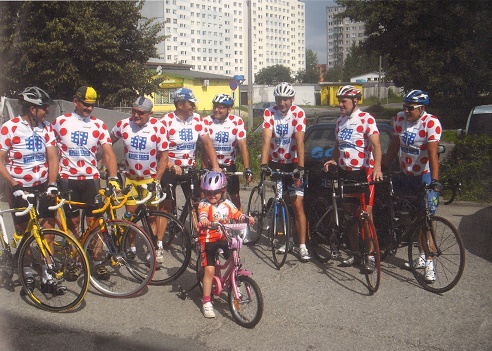 Przedstawia drużynę kolarzy piotrkowskich na Tour de Pologne dla Amatorów w 2011 r.: drugi od prawej Adrian Mogiła - kolarz, właściciel sklepu PHU Rowery S.C., w środku na rowerze jego wnuczka.