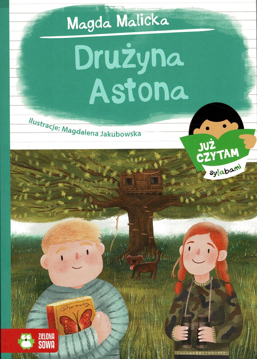 Drużyna Astona ma swoją tajną siedzibę w domku w koronie dębu. Kiedy kryjówka drużyny zostaje odkryta, Karola i Miłosz muszą stawić czoła bardzo trudnym i przykrym wydarzeniom, a ich domek zostaje zniszczony. Kim jest tajemniczy tytułowy Aston? Czy pomoże im odnaleźć sprawców zniszczenia ich bazy? Aston ma w końcu niezłego nosa! O serii Już czytam sylabami: Ułatw swojemu dziecku początek przygody z literaturą! Seria Już czytam sylabami to idealna lektura na pierwsze, samodzielne spotkania z książką. Każdy tom zawiera cztery krótkie opowiadania, w których słowa podzielono na sylaby za pomocą wyróżnienia kolorem, a także słowniczek trudnych wyrazów i dwa zadania utrwalające zdobyte umiejętności lub wiedzę. W opowiadaniach została wykorzystana sylabowa metoda nauki czytania, która najpełniej odzwierciedla naturalny sposób kształtowania się mowy dziecka od samogłosek, poprzez sylaby, wyrazy po zdania. Metoda ta polecana jest także dzieciom neurotypowym, mającym trudności rozwojowe oraz dzieciom wykazującym związane z ryzykiem dysleksji trudności w czytaniu i pisaniu.