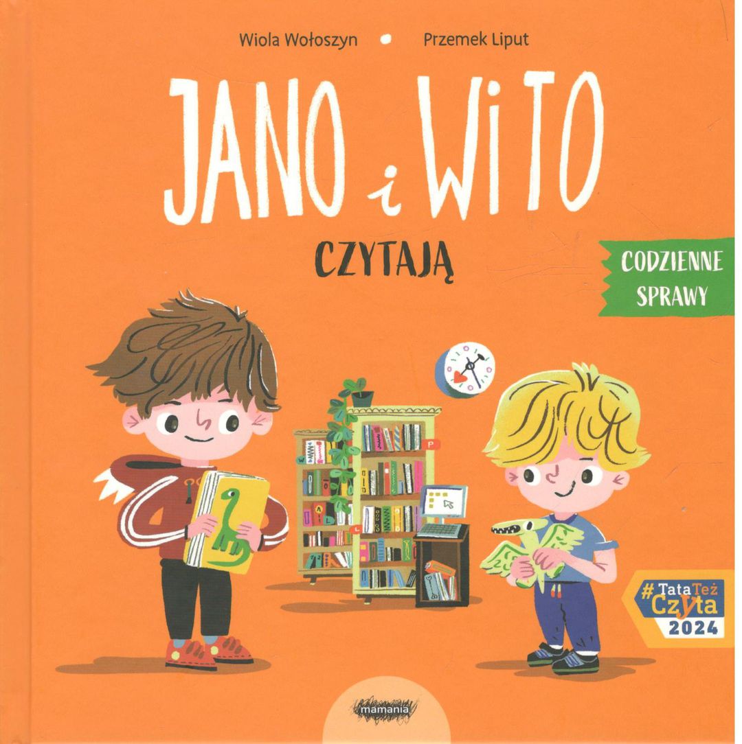 Jano i Wito czytają / [tekst:] Wiola Wołoszyn ; [ilustracje:] Przemek Liput. - Warszawa : Mamania, copyright 2024. - [22] strony : ilustracje ; 20x20 cm.