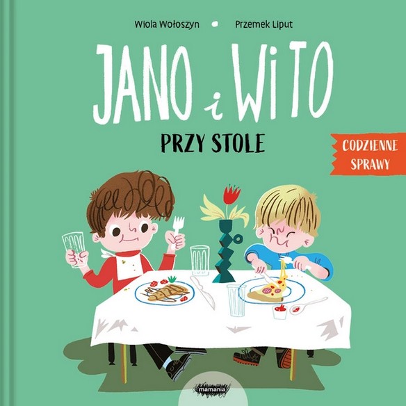 Jano i Wito przy stole / [tekst:] Wiola Wołoszyn, [ilustracje i projekt okładki:]Przemek Liput. - Warszawa : Mamania, copyright 2025. - [22] strony : ilustracje kolorowe ; 20x20 cm.