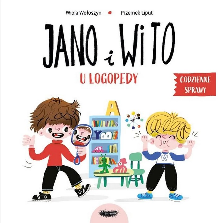 Jano i Wito u logopedy / [tekst:] Wiola Wołoszyn ; [ilustracje:] Przemek Liput. - Warszawa : Mamania, copyright 2024. - [21] stron : ilustracje ; 20x20 cm.