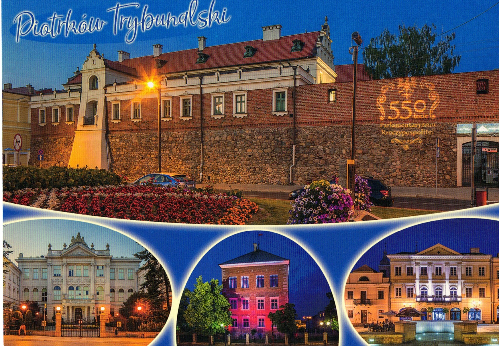 Pocztówka z uchwyconym (wyświetlonym na murze) logo z okazji obchodów 550-lecia Parlamentaryzmu Rzeczypospolitej w Piotrkowie.