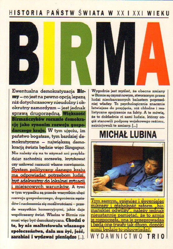 O Birmie, będącej w Polsce prawie terra incognita, wiemy niewiele. Tymczasem państwo to było przez wieki jednym z najważniejszych mocarstw politycznych i militarnych w Azji. Birma stworzyła Trzy Imperia, będące w okresie prekolonialnym jednymi z najważniejszych organizmów państwowych kontynentu azjatyckiego. Podbita i skolonizowana przez Brytyjczyków, po uzyskaniu niepodległości w 1948 podniosła się w latach 50-tych XX wieku do roli jednego z liderów ruchu państw niezaangażowanych. Niestety, na skutek fatalnej polityki rządzącej od 1962 roku junty wojskowej, Birma popadła w izolację i nędzę. Jej losy dramatycznie odmieniły się wszakże w 2011 roku na skutek zainicjowanego programu reform i otwarcia na świat. To właśnie te reformy sprawiły, że Birma jest obecnie jednym z najbardziej fascynujących państw na politycznej mapie świata